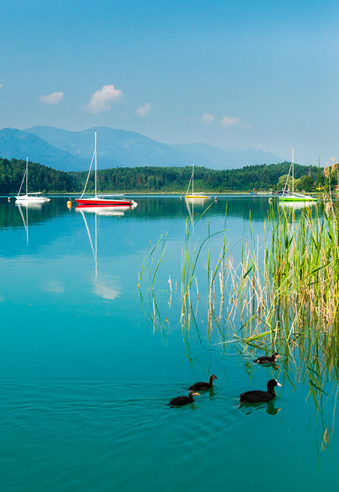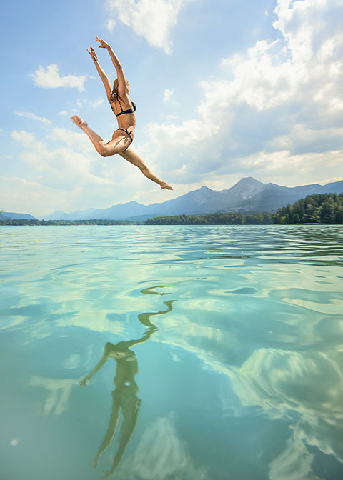 Der Faaker See, dessen türkisblaue Farbe völlig unretuschiert für jedes erdenkliche Postkartenmotiv gut ist. Der 2,2 Quadratkilometer große, bis zu 30 Meter tiefe und bis zu 27 Grad warme Faaker See zählt zu den beliebtesten Badeseen Österreichs. Sich treiben lassen, plantschen oder richtig aktiv werden: Mit Temperaturen bis zu 27 Grad und vielfältigen Wassersport-Möglichkeiten lockt der Faaker See die Gäste des Dietrichsteinerhofs ins Freie. Das hauseigene Strandbad ist ein idealer Ausgangspunkt für Ihre Wassersport-Abenteuer.