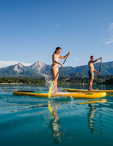 Stehend übers Wasser gleiten. Mit dem SUP-Board kann man den Faaker See aus einer völlig neuen Perspektive erleben und entdecken. Mühelos gelangen Sie mit dem SUP an Orte, die für Fußgänger unzugänglich, für Schwimmer zu weit entfernt und für Segler unschiffbar sind. Durch die aufrechte Position haben sie stets einen wunderbaren Über- und Ausblick. Für Könner und Anfänger geeignet, macht SUP nicht nur von Anfang an Spaß, es fördert auch Balance und Ausdauer.